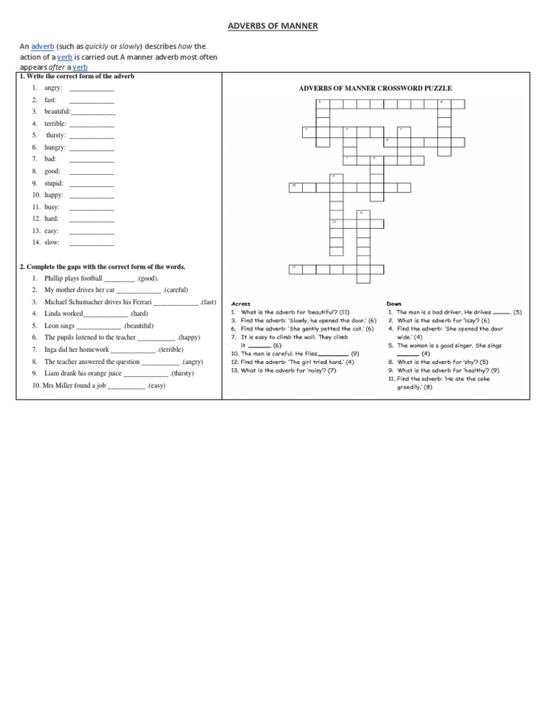 Rules for forming adverb of manner. The adverb must be placed either before the verb or at the end of the clause. Atives and adverbs of manner.through pictures students will be able to infer the meaning without using their first language.the use of. Adverbs of manner mainly modify verbs and tell us the way in which something happens. I'm afraid i'm not familiar with any commonly accepted classification of adverbs.